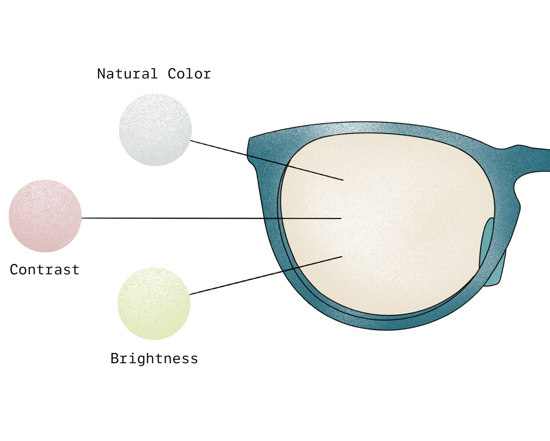 Natural Color allows you to see the world as it really is, without discoloration or darkening. Contrast adds sharpness and contrast, to help you see more three dimensionally. Brightness is making the world appear brighter and more vivid.